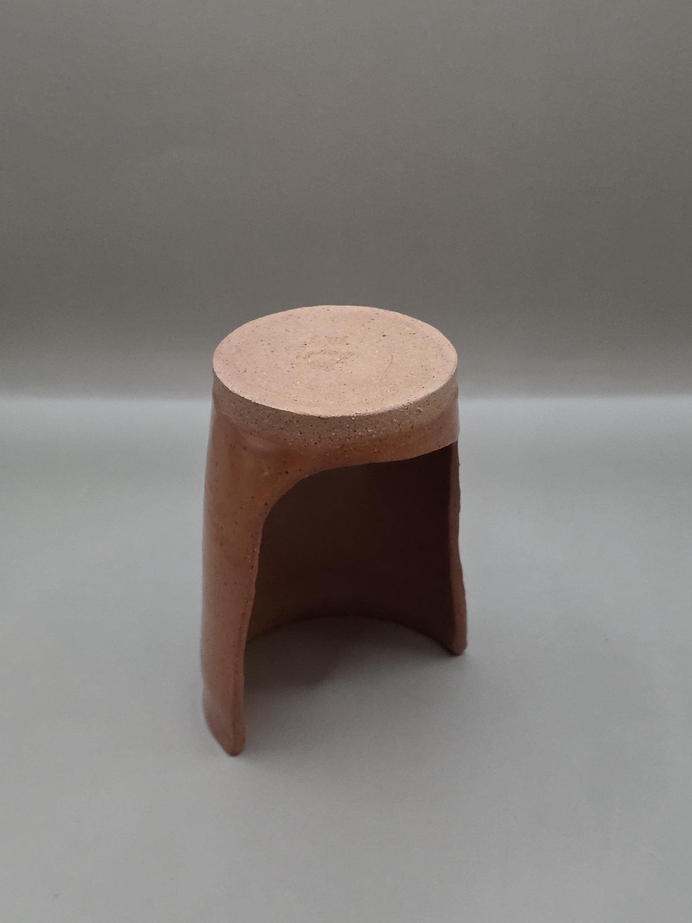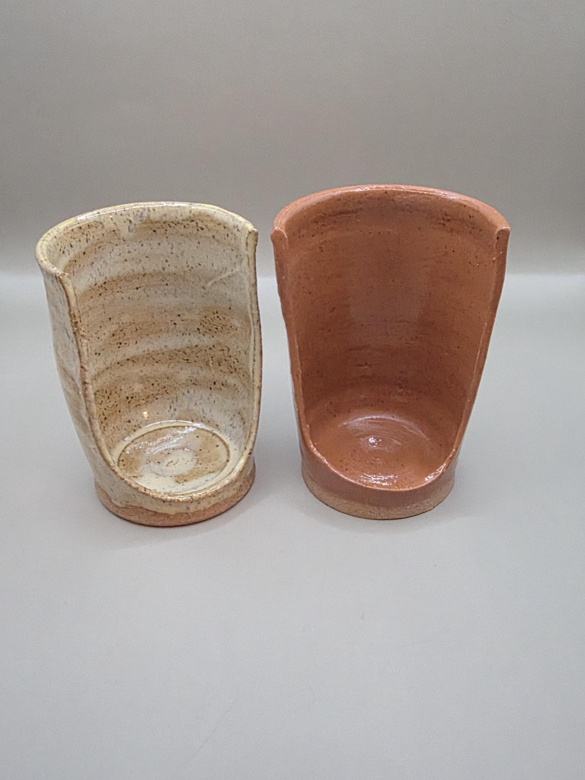 Standing spoon rest made from stoneware brown speckle clay that begins as a cylinder thrown on a pottery wheel, with clay cut away to make room for cooking utensil. Keeps cooking spoons and utensils tidy and within reach, while saving counter space. Each is unique with slight variation in size, available in two glaze colors - terra cotta orange (4.5 in x 3.5 in) and lemon (4.25 in x 3 in). Dishwasher safe.
