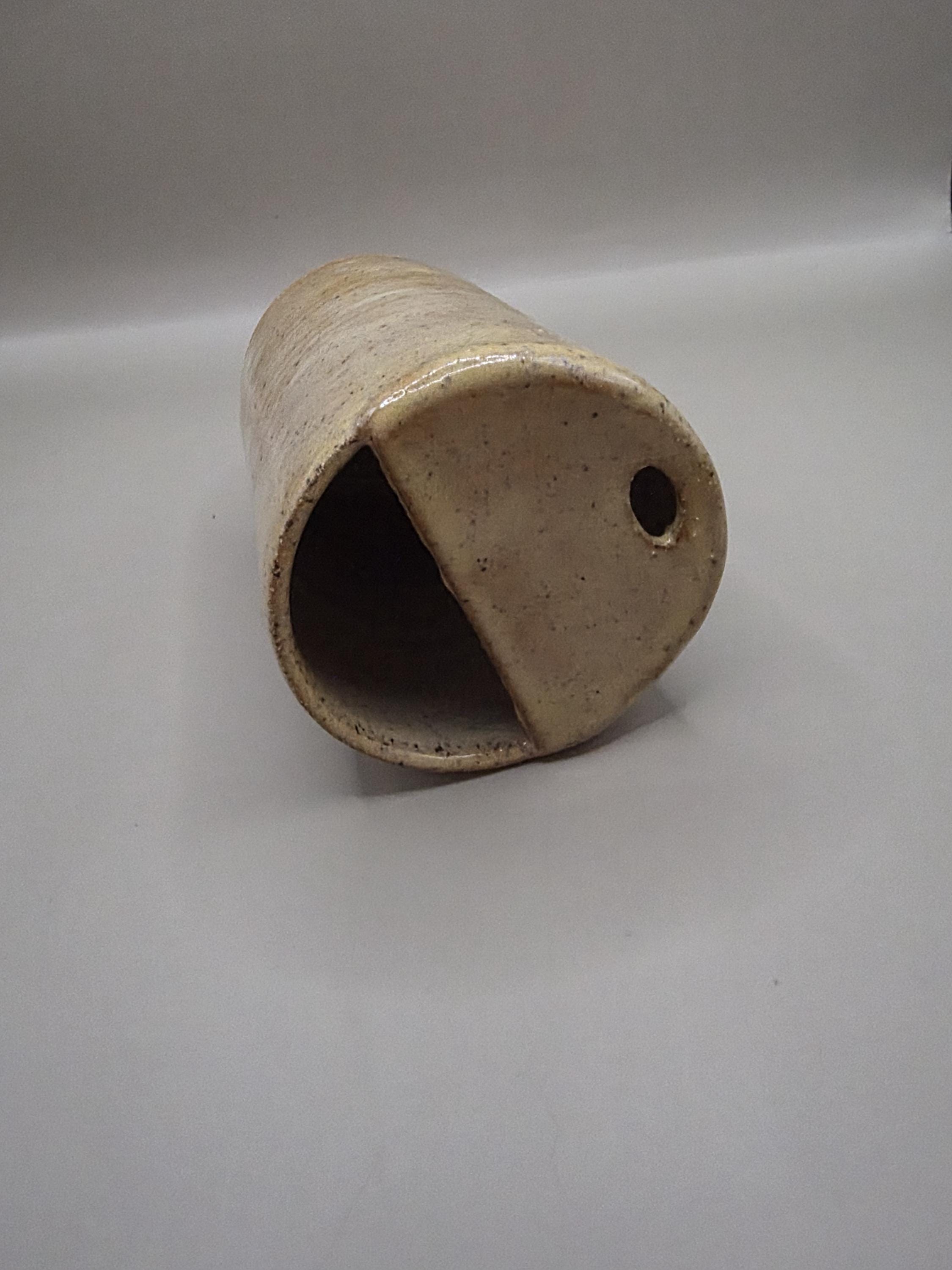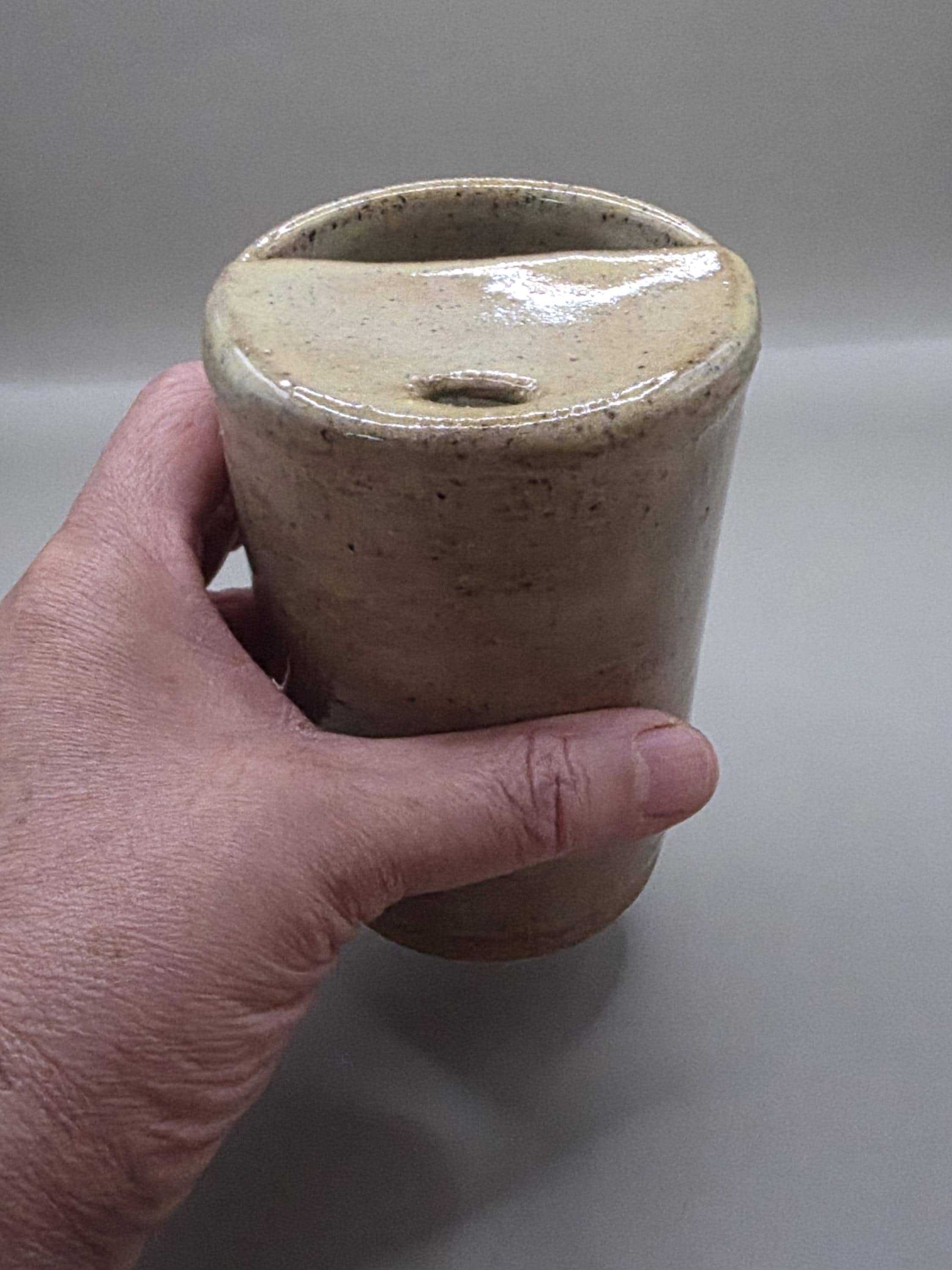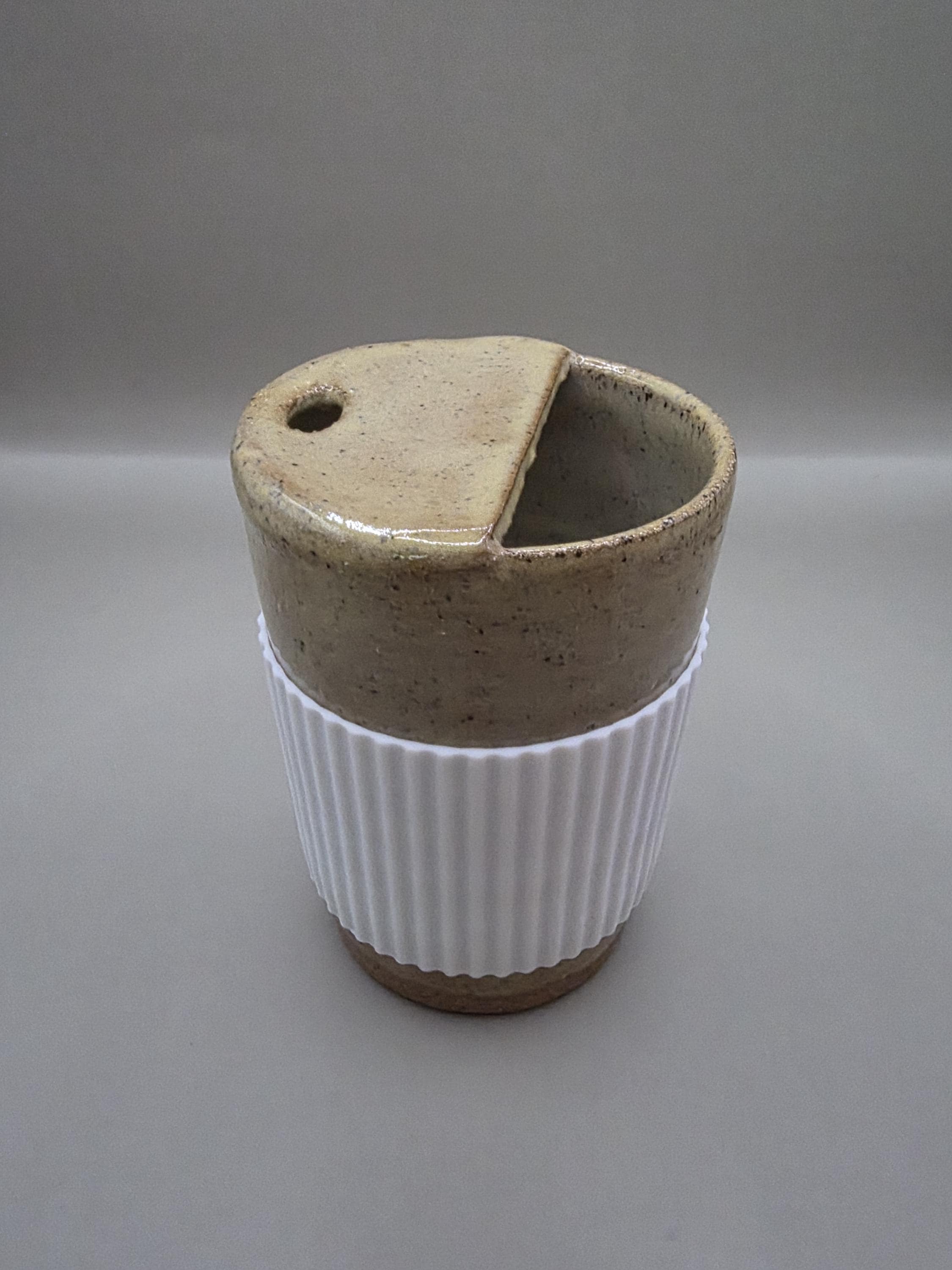 Stoneware clay to-go-cup thrown on a pottery wheel with hand-built lid attached. Brown speckles in clay show through lemon glaze. Holds 10 ounces and is about 4.5 in tall X 3 in wide. Free white silicone sleeve included that can be used with hot beverages. Dishwasher and microwave safe.