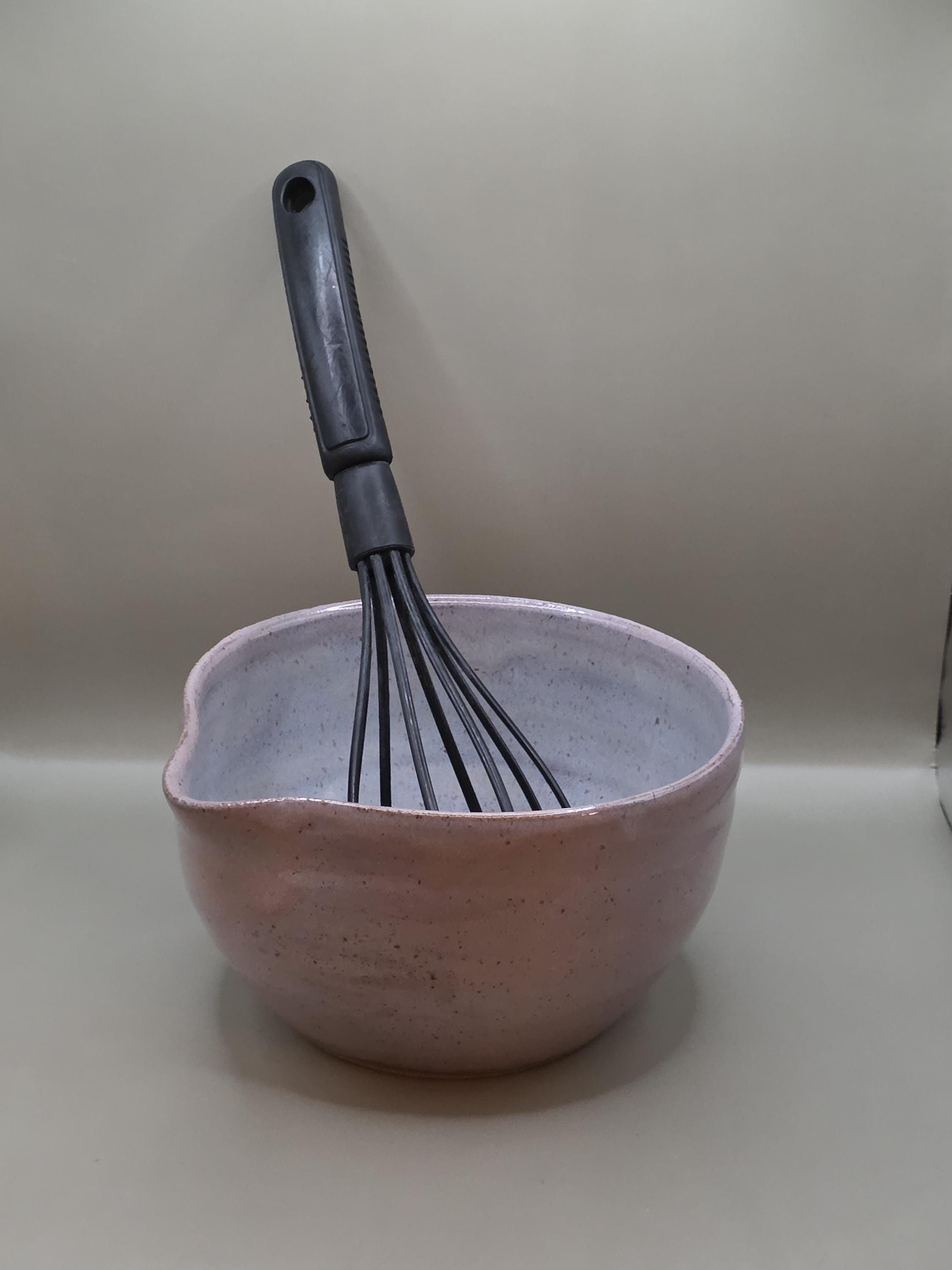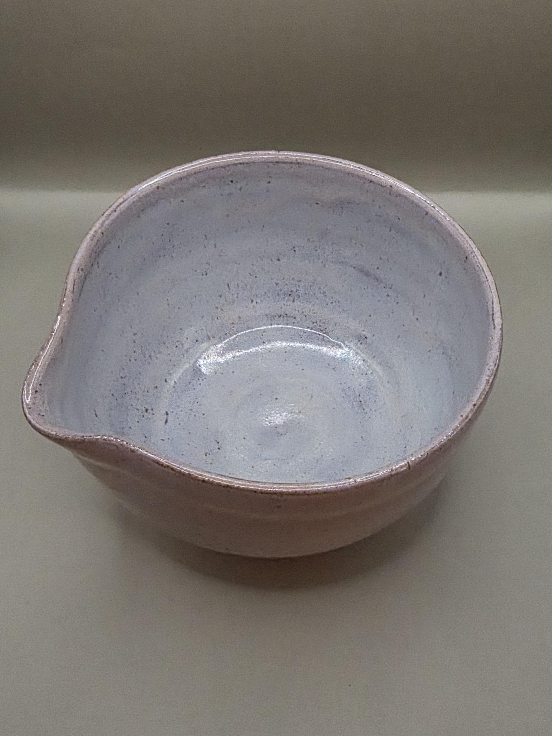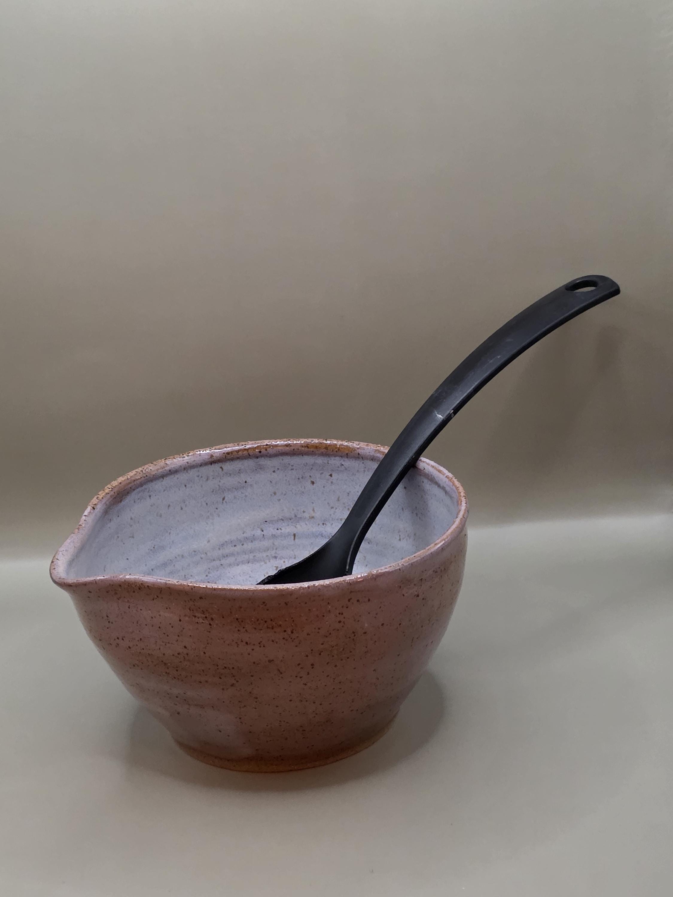 Small, Medium, and Large Nested Batter Bowls made from a speckled stoneware clay, thrown on pottery wheel. Pulled spout for pouring. Brown specks show through a lavender glaze. Sizes: Large ( 4.25 x 7.75 inches-holds 6 cups), Medium (3.5 x 6.5 inches-holds 3 cups), Small (3.25 x 5.25 inches-holds 2 cups). Purchase individually or save with $4 off of a three piece set! Dishwasher and microwave safe.