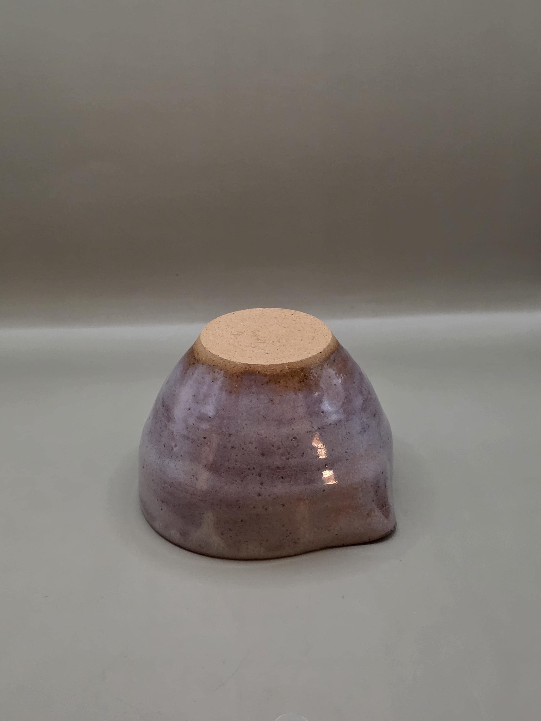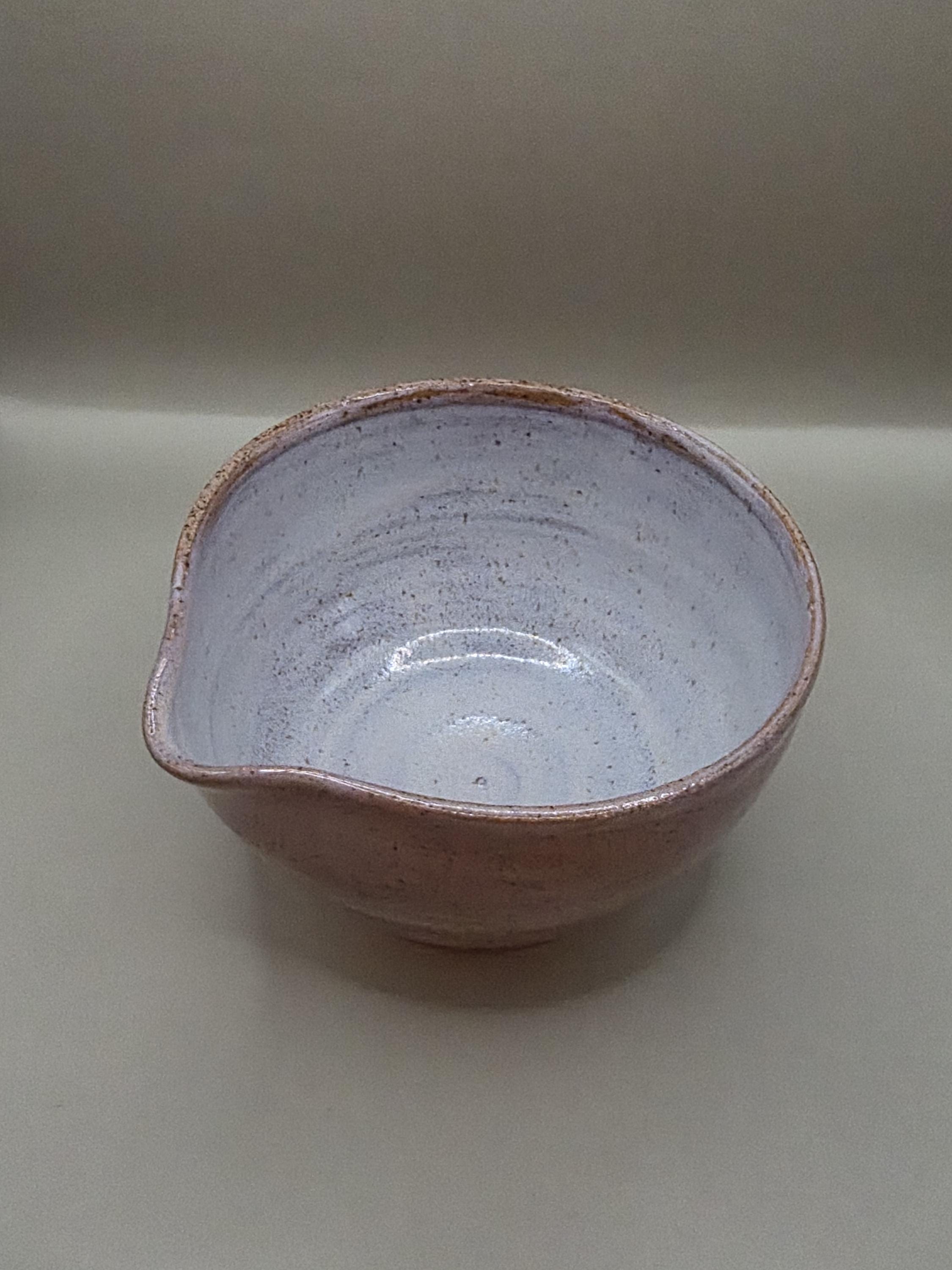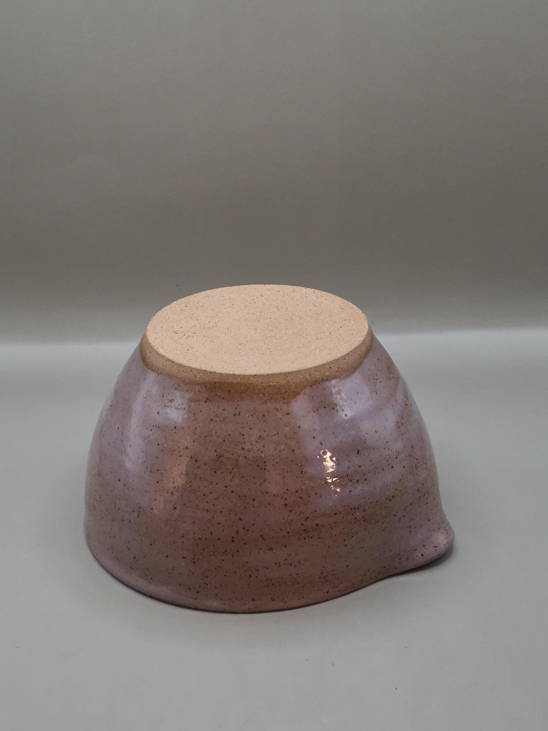 Small, Medium, and Large Nested Batter Bowls made from a speckled stoneware clay, thrown on pottery wheel. Pulled spout for pouring. Brown specks show through a lavender glaze. Sizes: Large ( 4.25 x 7.75 inches-holds 6 cups), Medium (3.5 x 6.5 inches-holds 3 cups), Small (3.25 x 5.25 inches-holds 2 cups). Purchase individually or save with $4 off of a three piece set! Dishwasher and microwave safe.